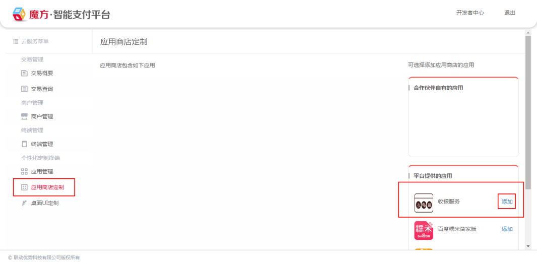 当然,集成商还可以将"平台提供的应用"添加至集成商自有应用商店,如糯米、美团、口碑等商户常用的应用。