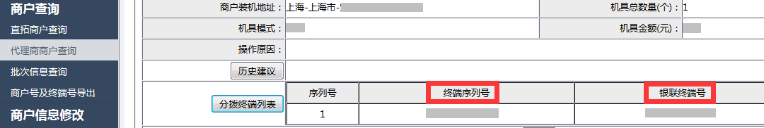 (2)、终端列表中的"终端序列号"及"银联终端号" 为联动电商线下收单进件平台的终端信息,如: