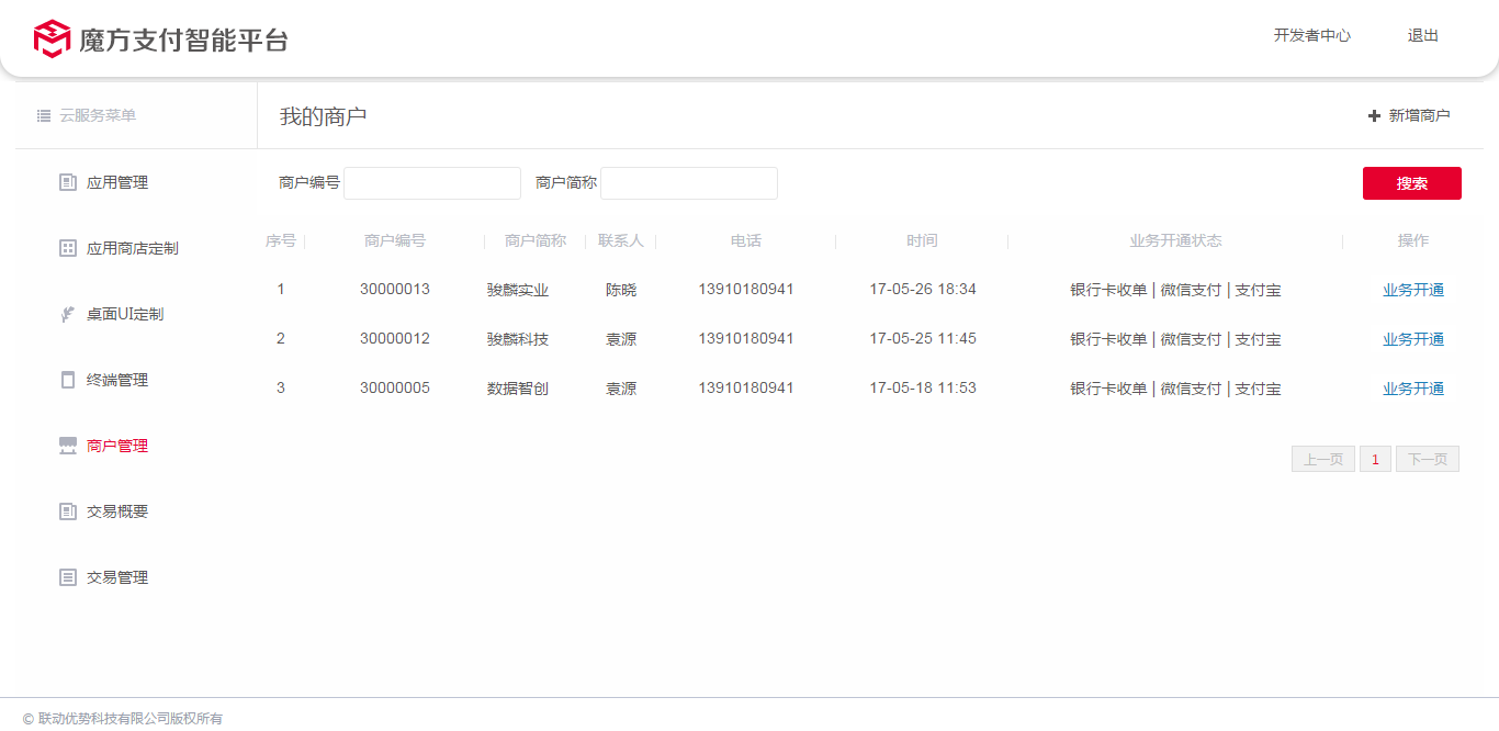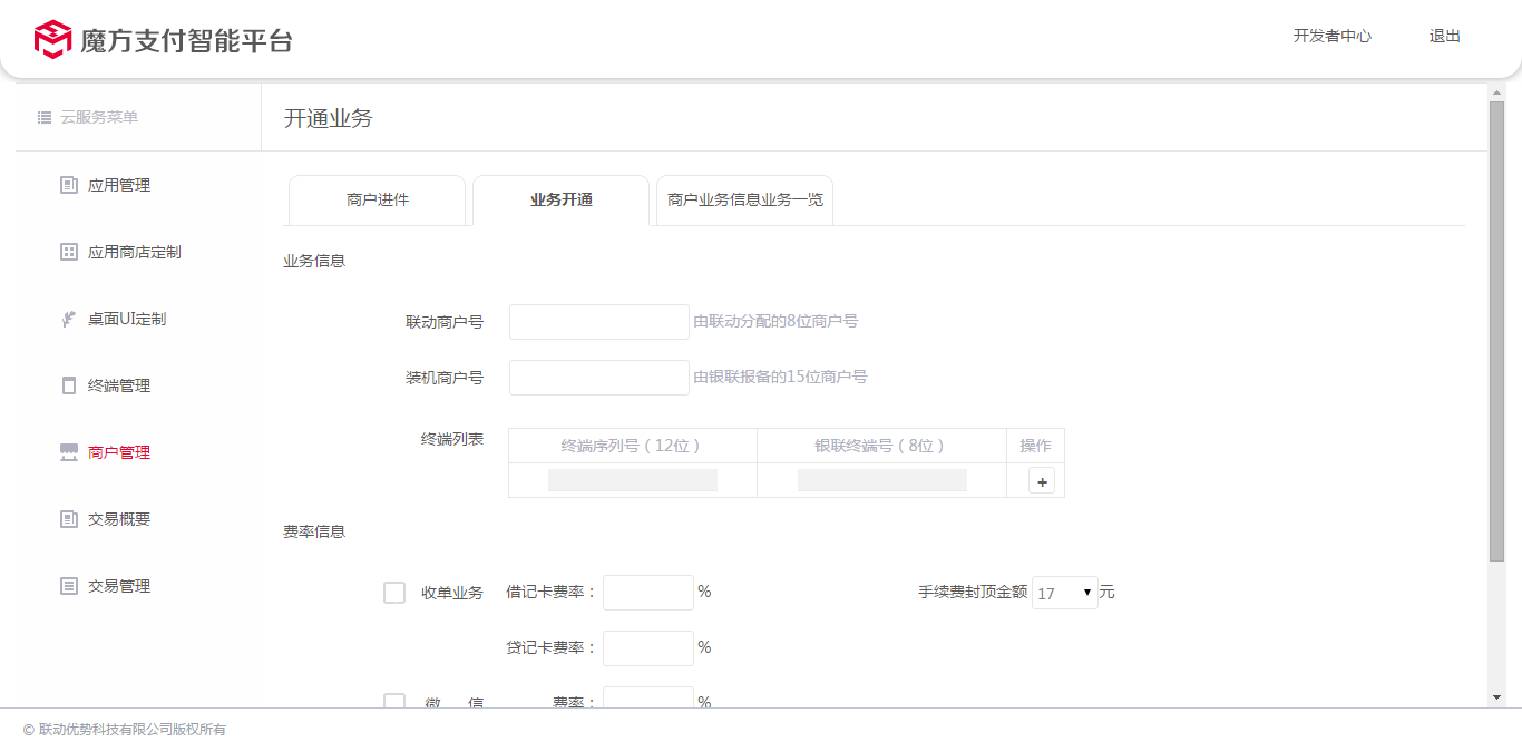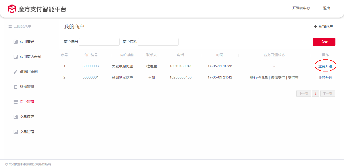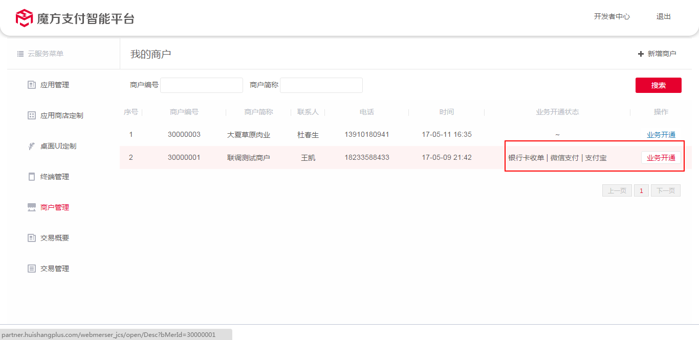 3、接入商户的操作管理,进行"业务开通",如图: