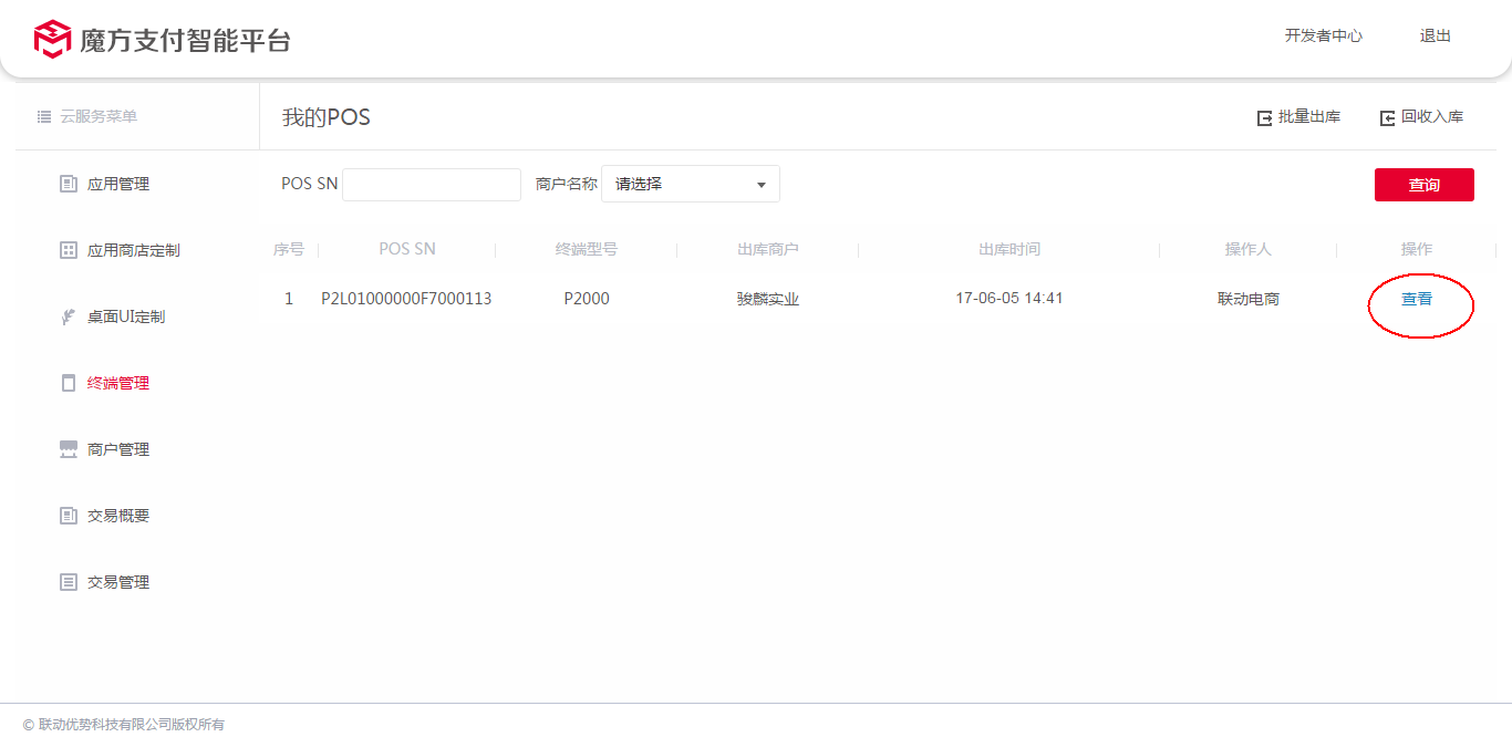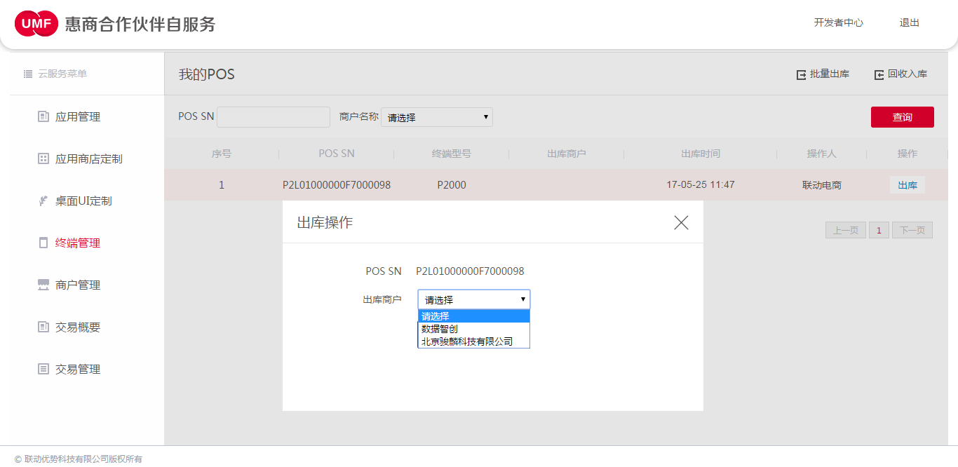 通过"终端管理"模块,选择某台终端的POS SN(未出库给商户状态),点击该终端的操作项"出库",在弹出的页面,选择将该终端出库的商户,选中后点击确定。即可将该终端出库给该商户。