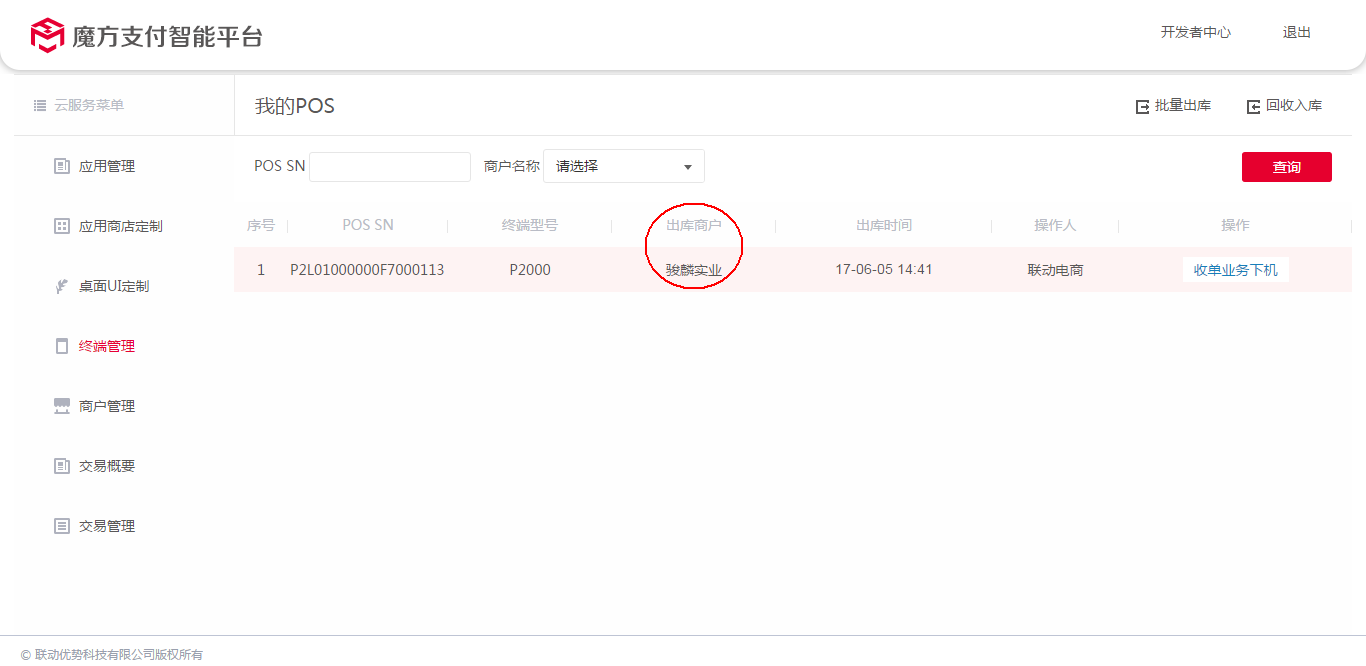 出库后的终端, 可见出库到的商户信息。如: