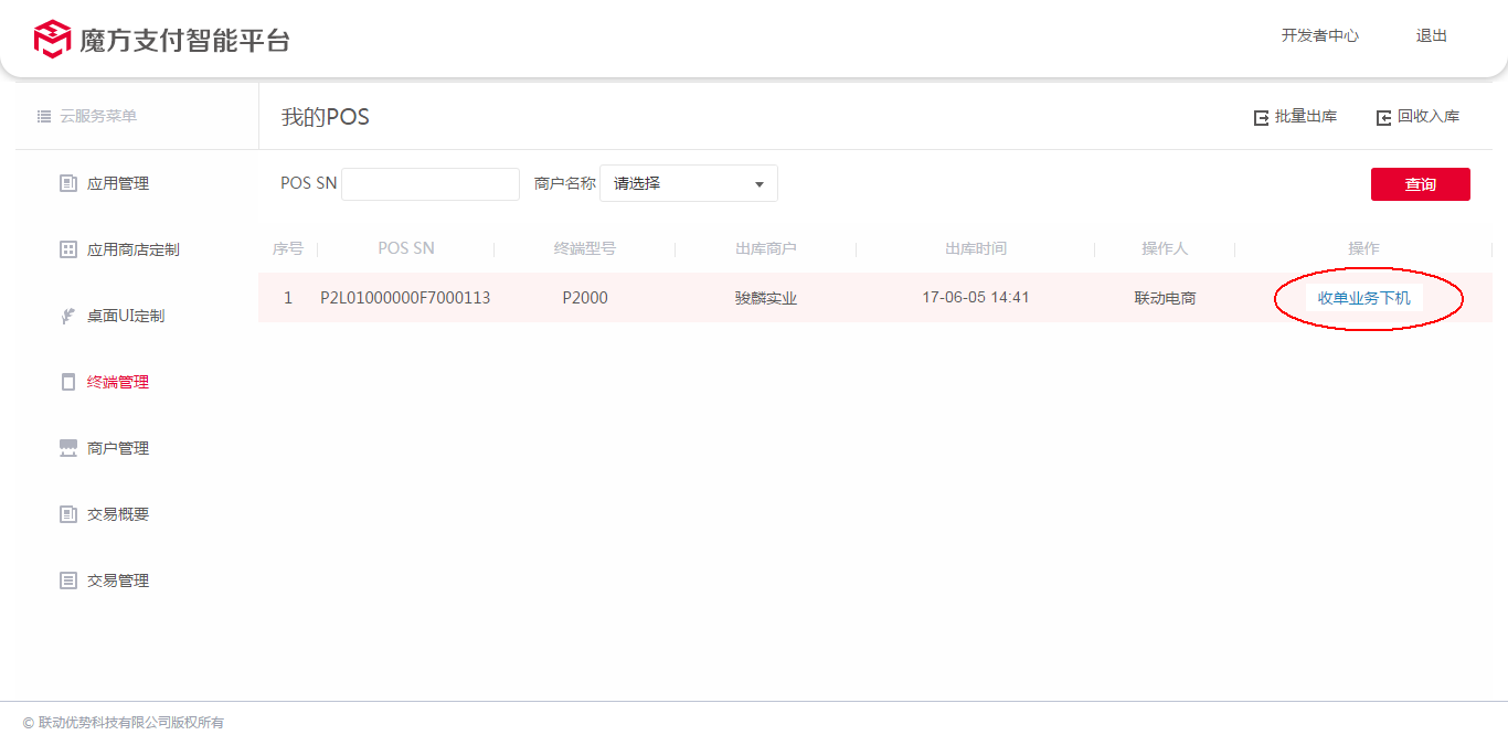 业务配置开通完成后,将终端分配给商户(俗称"下机"),即可进行业务开展。