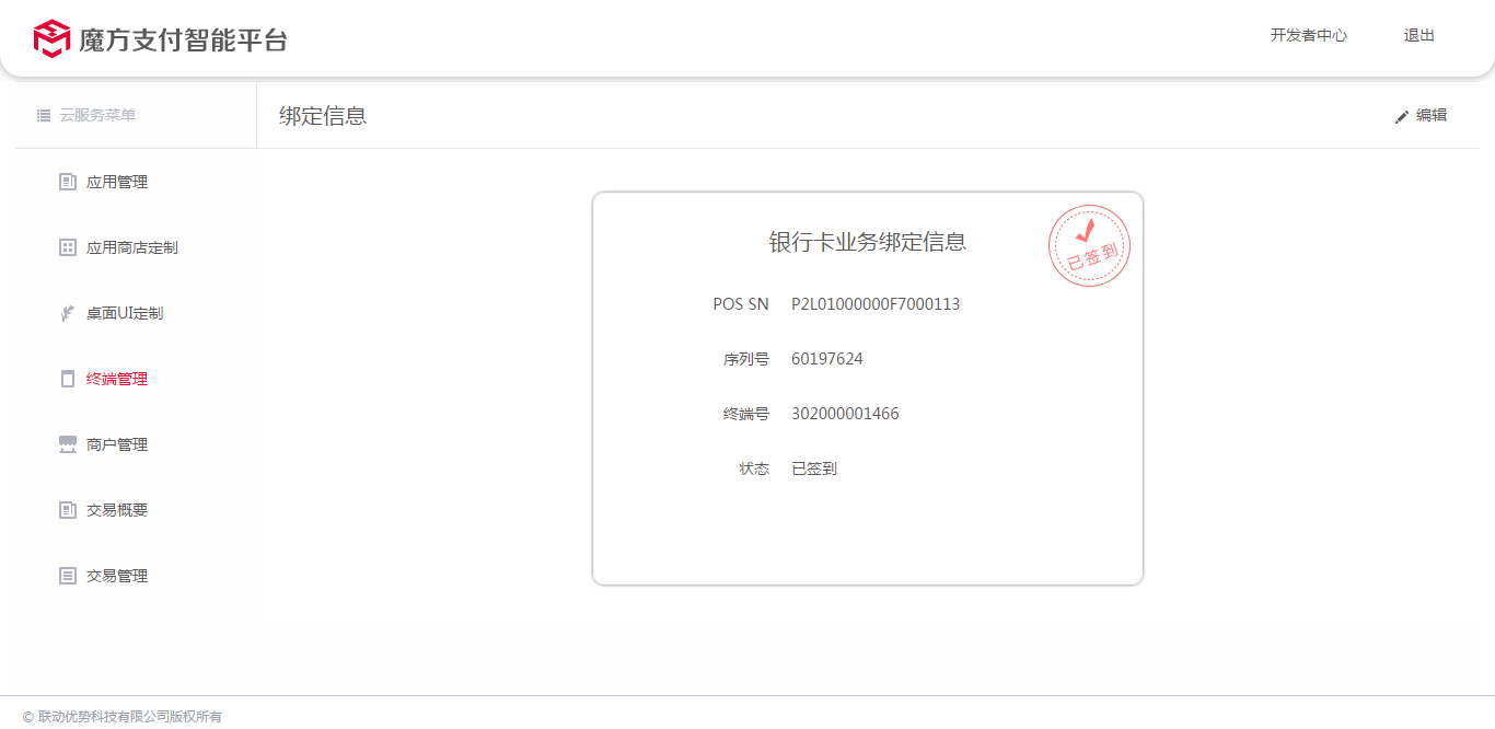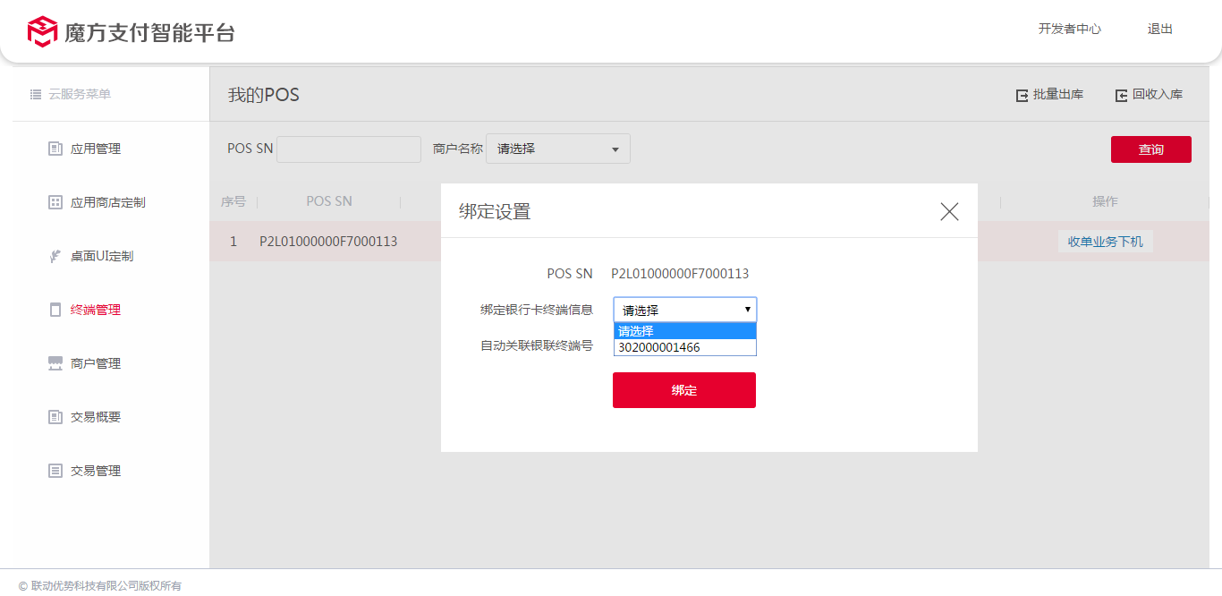 点击确定,即可将该终端绑定商户的终端序列号。