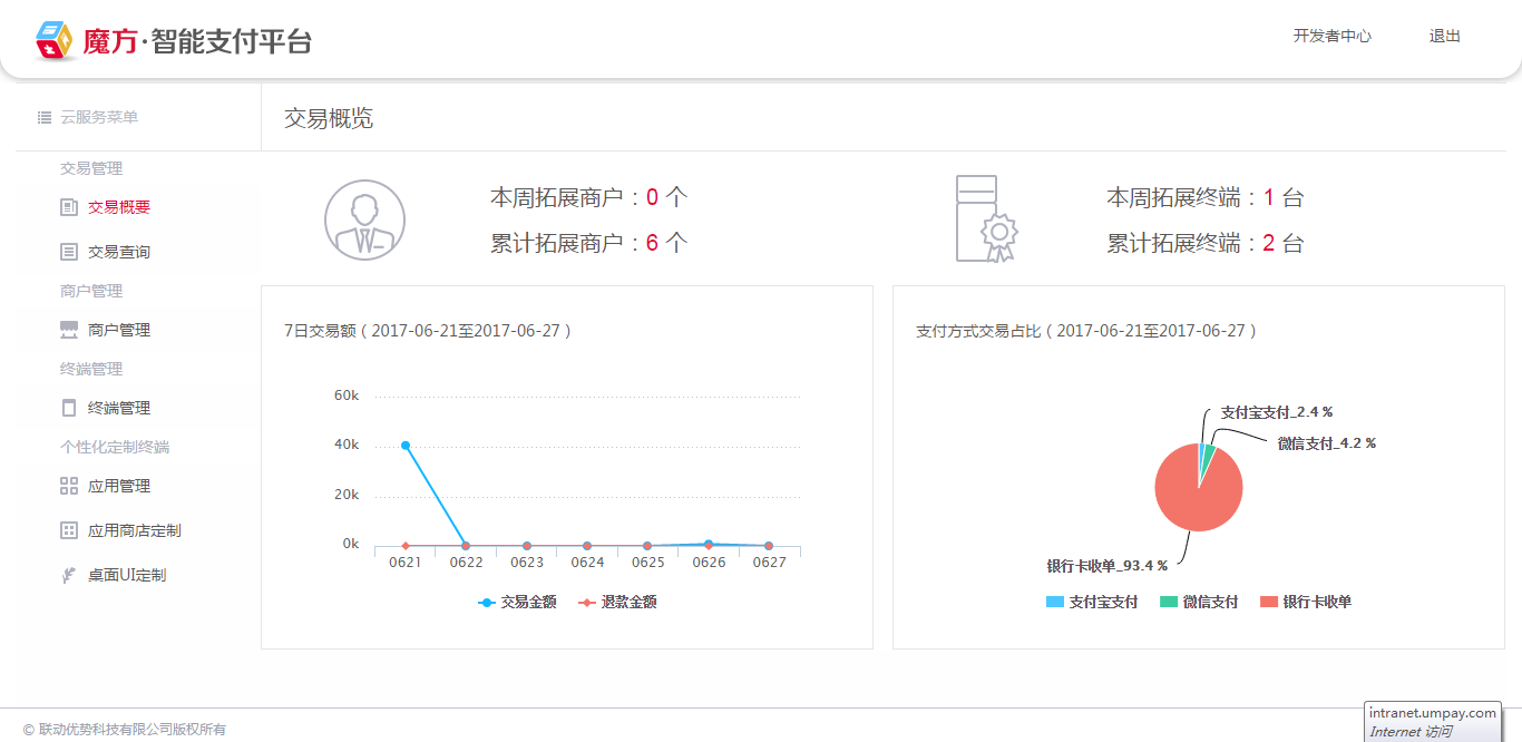 1、通过交易管理模块的"交易概览"查询拓展商户的情况,包括拓展商户数、铺设终端数、交易数据等,如图: