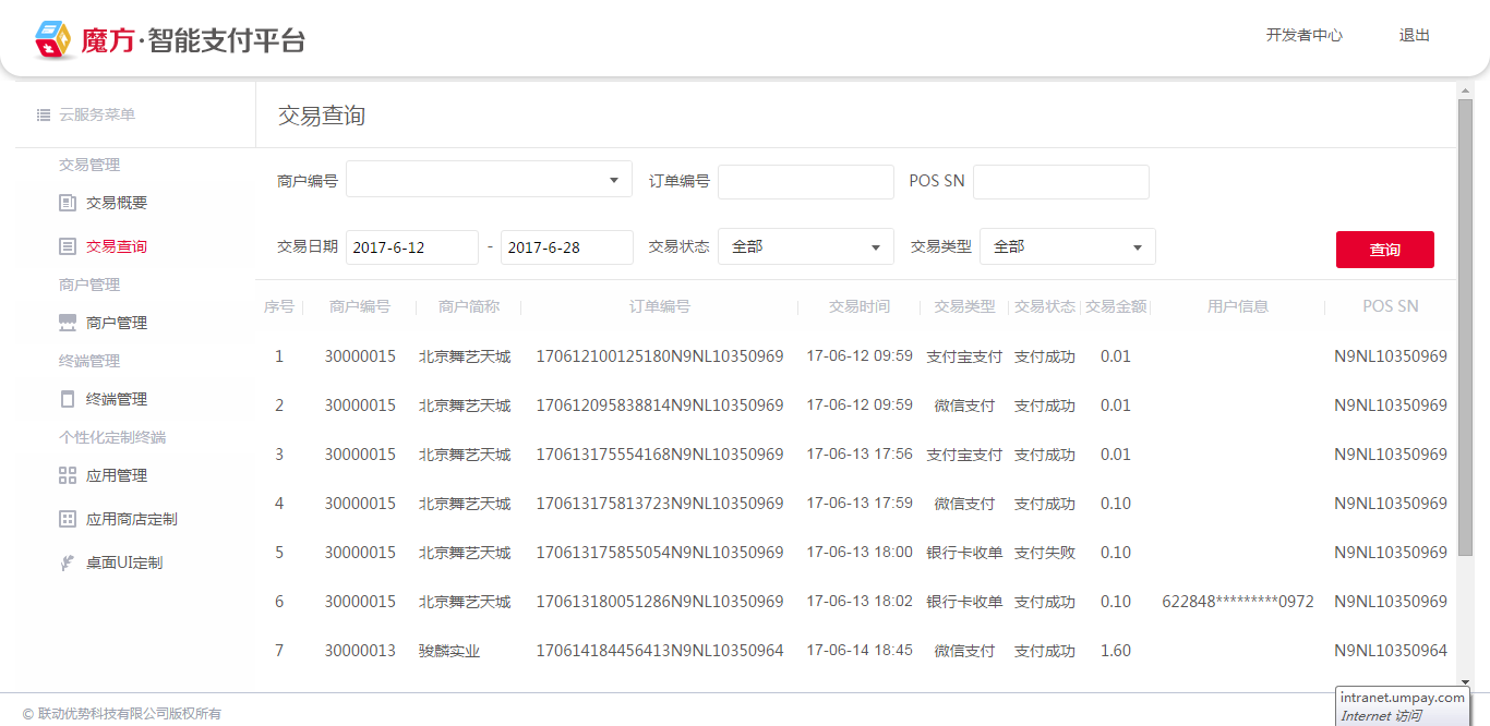 2、通过交易管理模块的"交易查询",查询商户的详细交易信息,支持按照商户ID、交易类型、交易状态、交易时间段等维度,查询交易信息,如图: