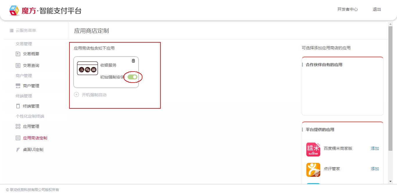 通过"个性化定制终端"的"应用商店定制",将"合作伙伴自有应用"中的"已创建的应用"(集成商创建,并审核通过的应用)添加至集成商自有应用商店,并可设置"初始强制安装"或"开机自动启动"。