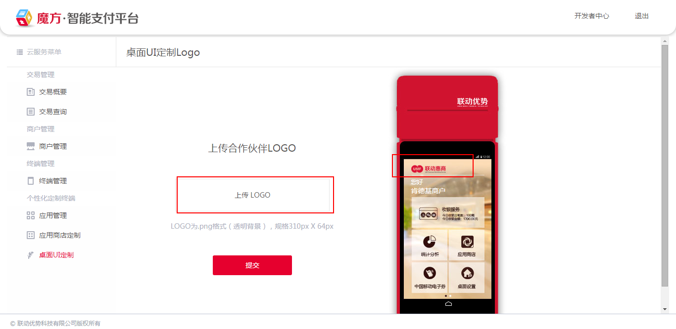 通过"个性化定制终端"的"桌面UI定制",点击"上传logo",将集成商的logo图片提交上去。上传后,示意如图: