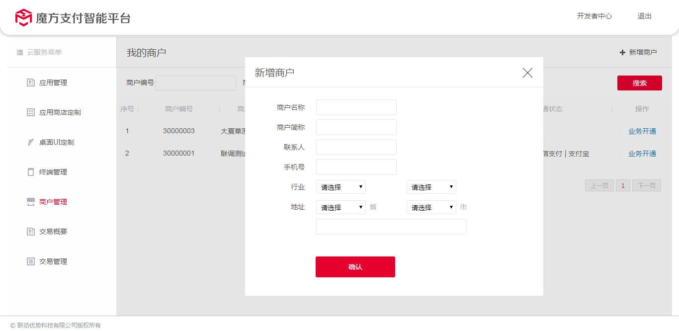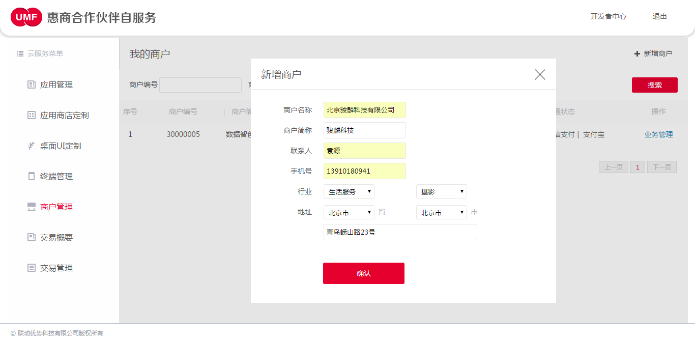 2、点击"新建商户",在弹出窗口根据提示,填写对应的商户信息后,点击"确定",完成商户的创建。